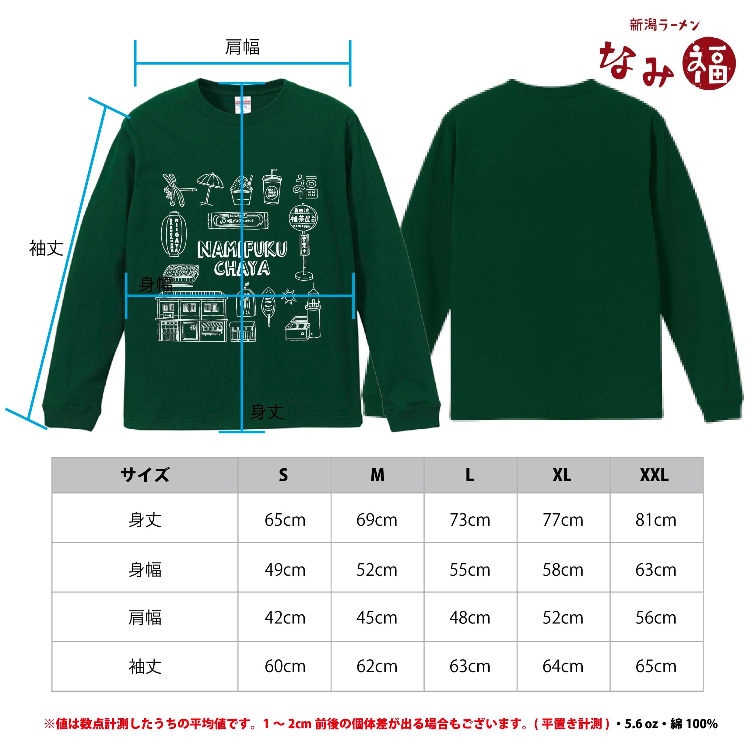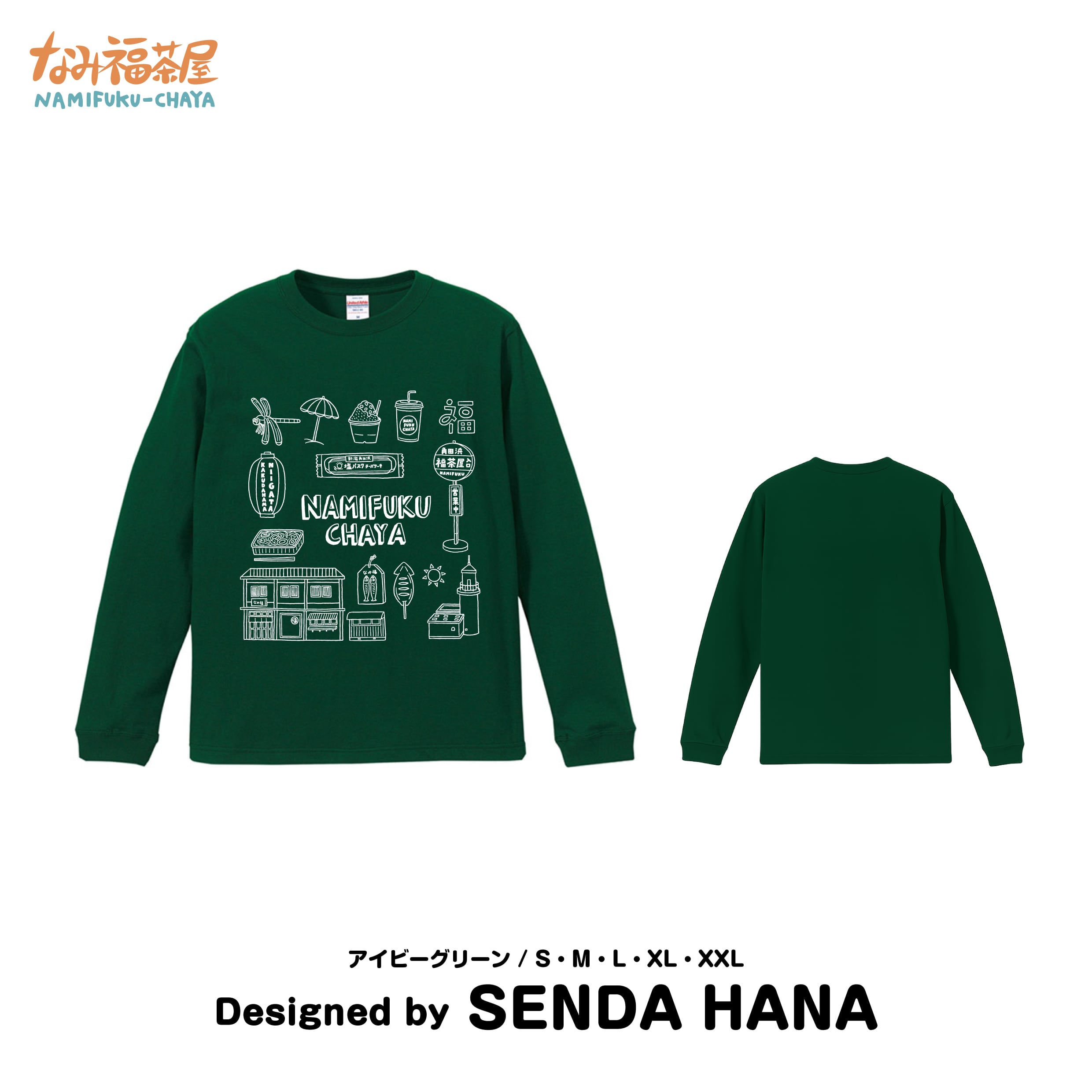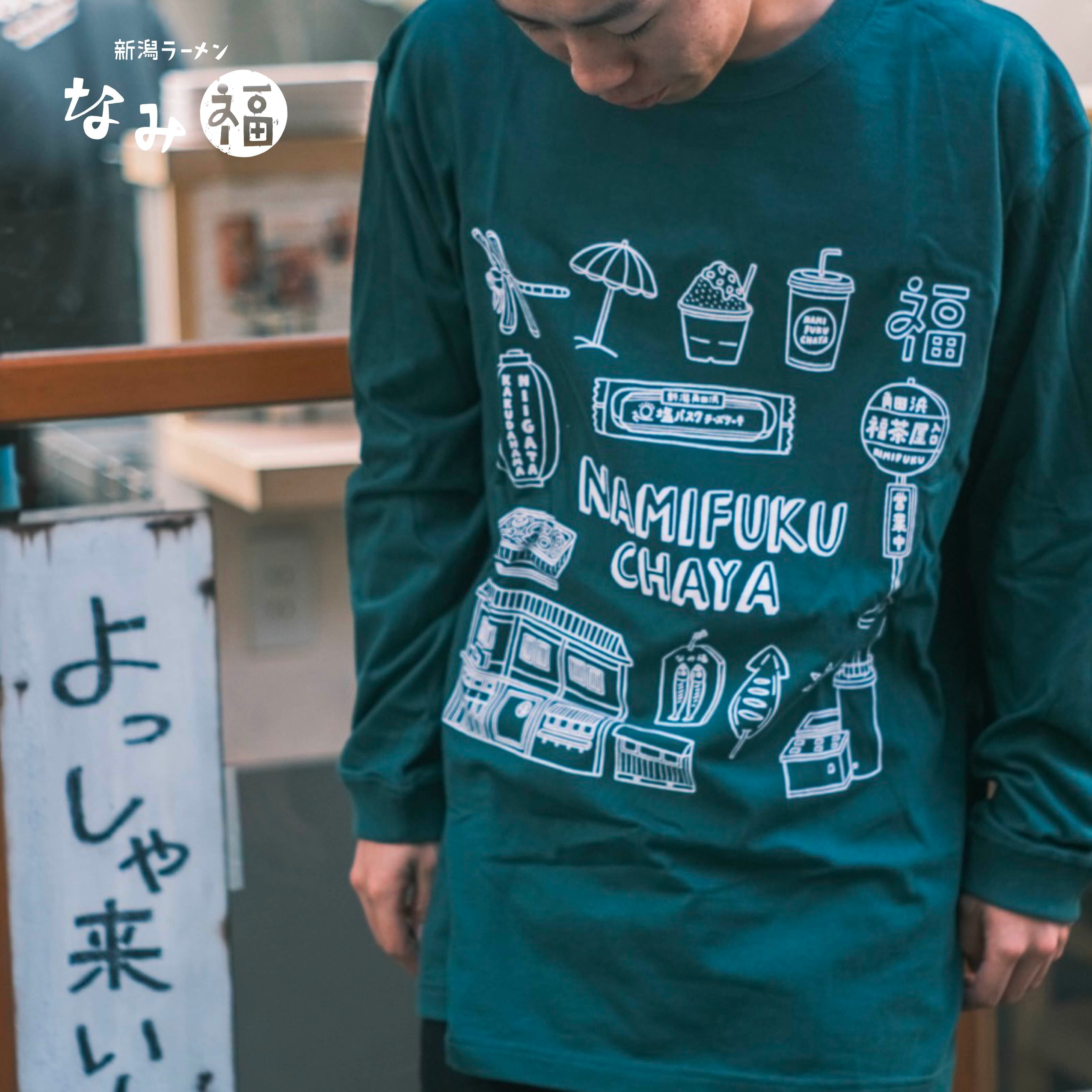 なみ福茶屋のモチーフがたくさん詰まったデザインのロングスリーブTシャツ。シンプルかつ大きくプリントされていて、ほどよく目を引く一枚です。