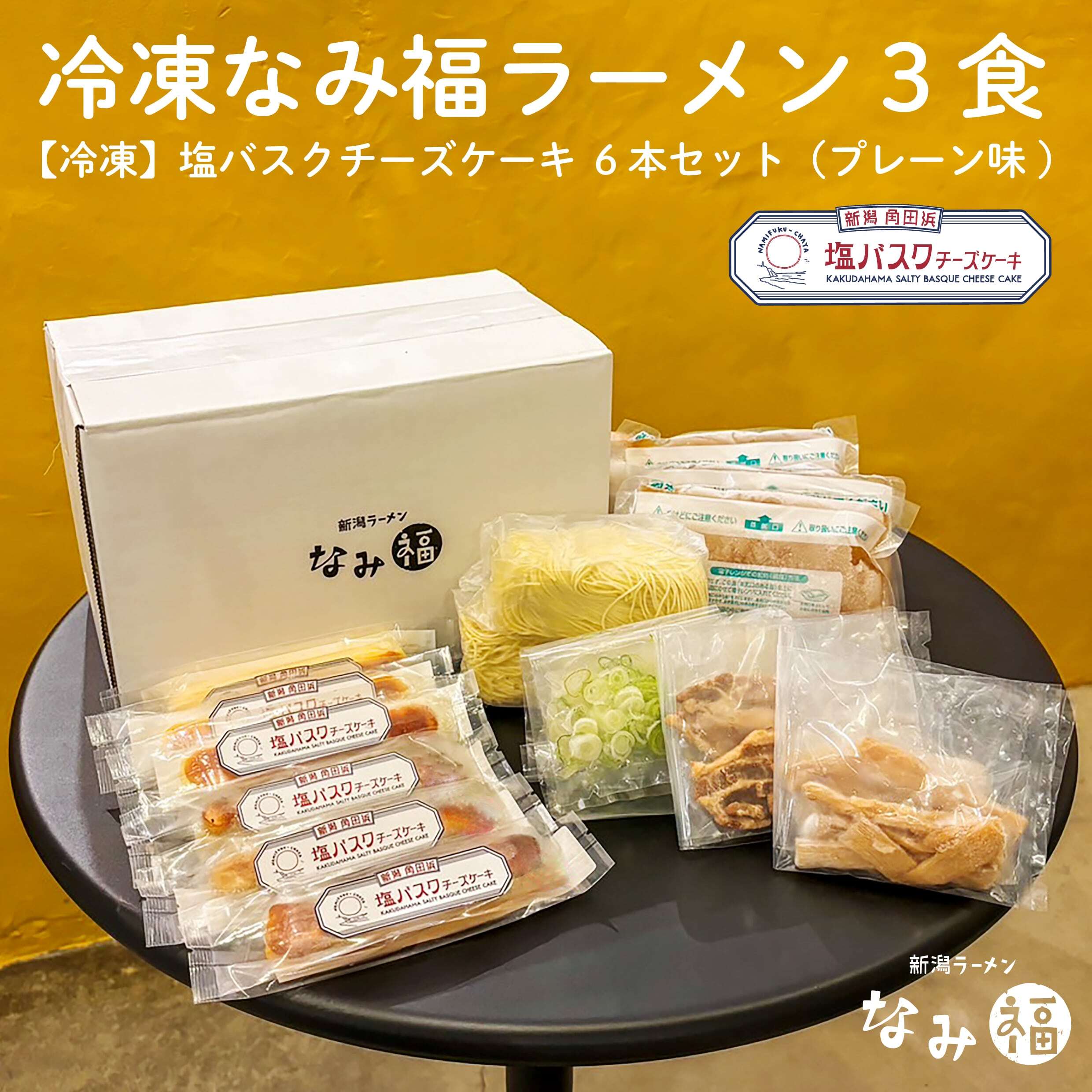 冷凍なみ福ラーメン(3食)と、人気の塩バスクチーズケーキ(プレーン)6本セット!ご家庭で手軽に美味しさを楽しめる、贅沢なセットです。
