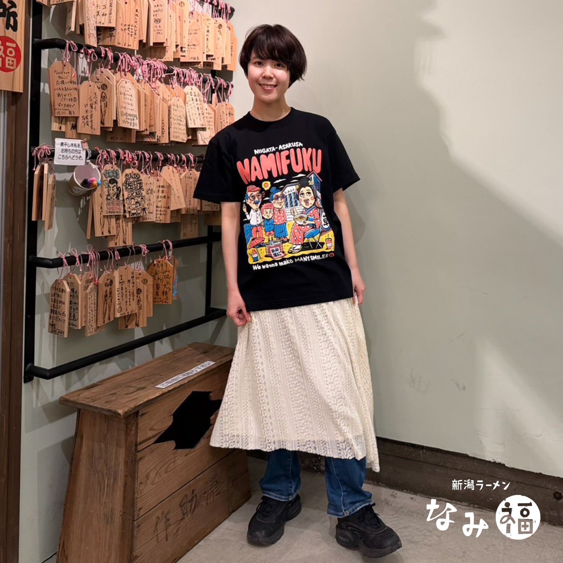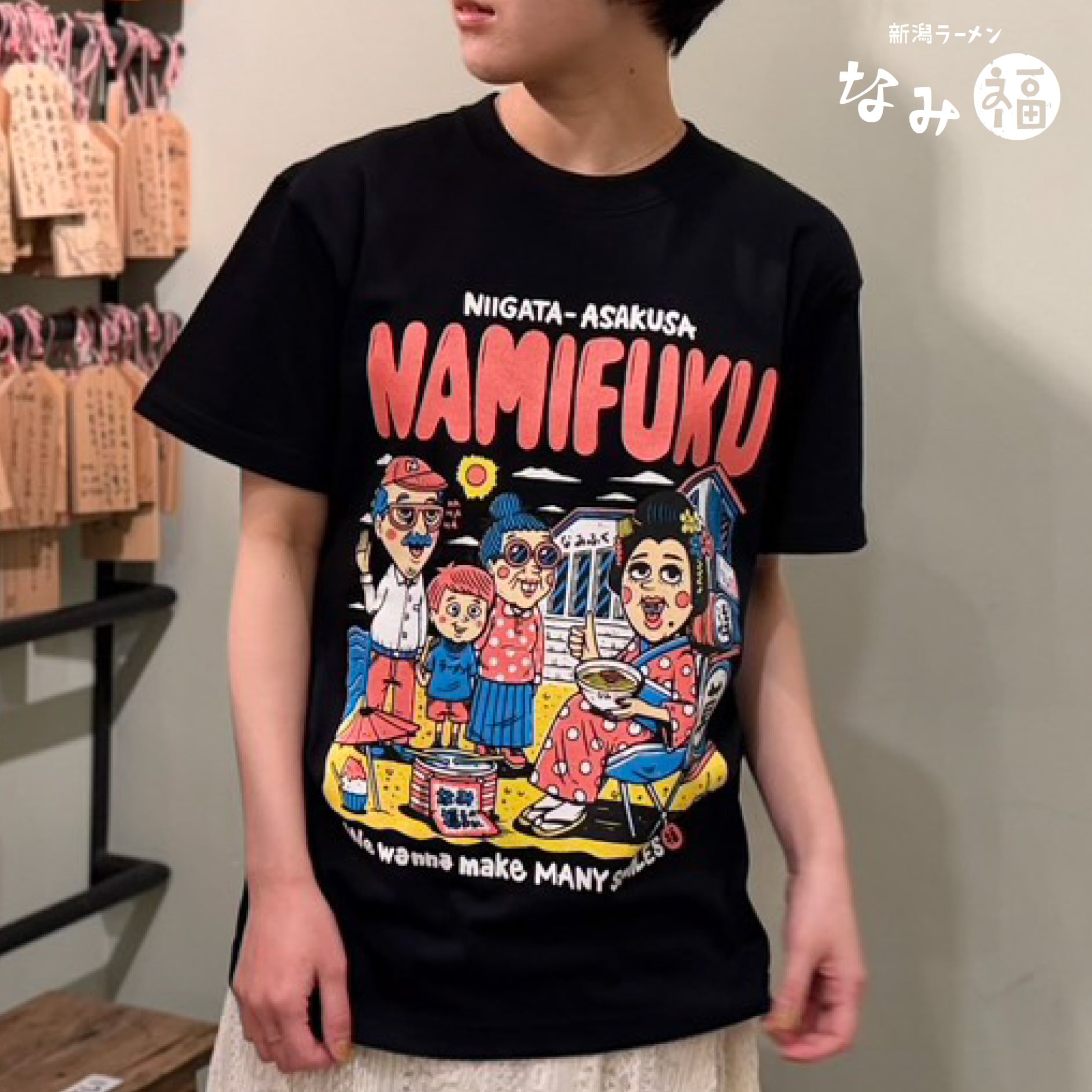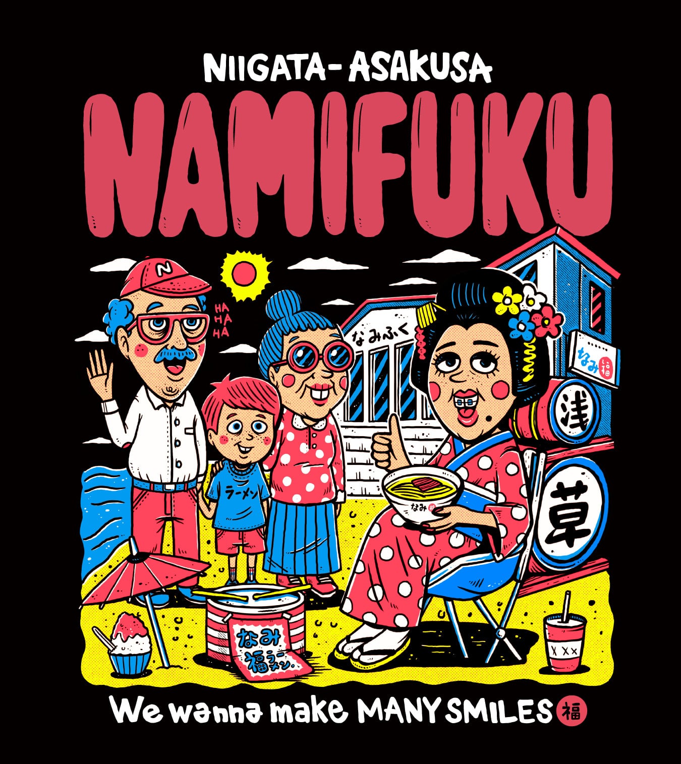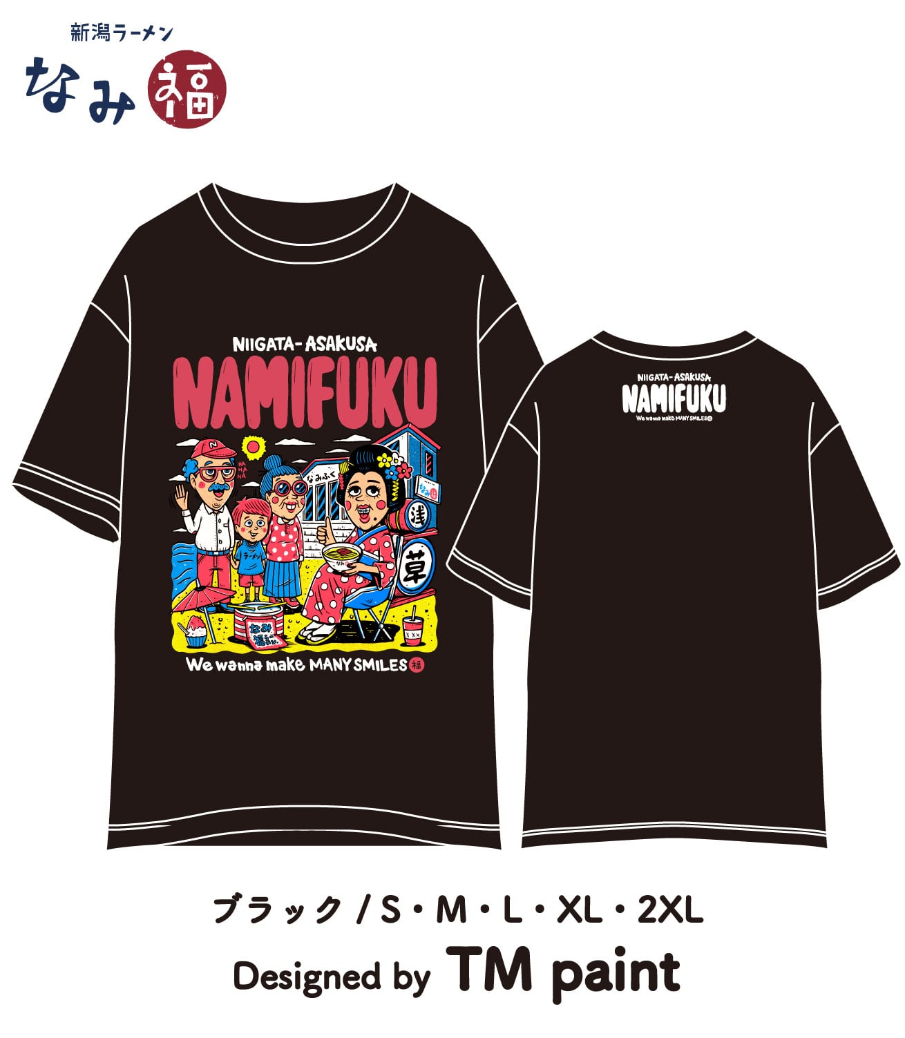 ちんどん屋のお嬢さんが浅草から角田浜に遊びに来た様子を描く、新潟と浅草を繋ぐ可愛いデザイン。元気が出る最高の仕上がりです。これを着て、角田浜にも浅草にも遊びに来てください!